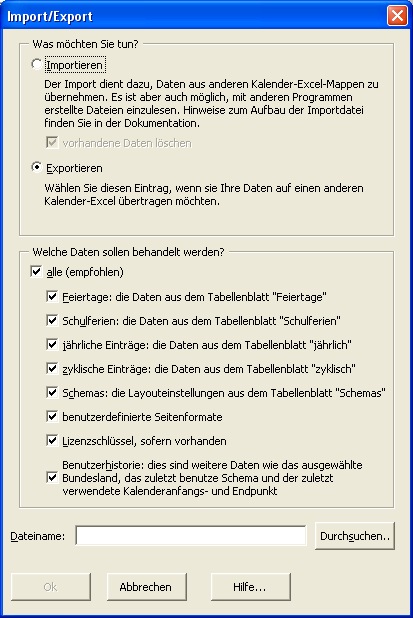 - Tragen Sie dann den Dateinamen der heruntergeladenen Datei inklusive Pfad im Dialogfenster von Kalender-Excel ein oder wählen Sie mittels der Schaltfläche Durchsuchen... die entsprechende Datei aus. Anschließend drücken Sie auf Ok.